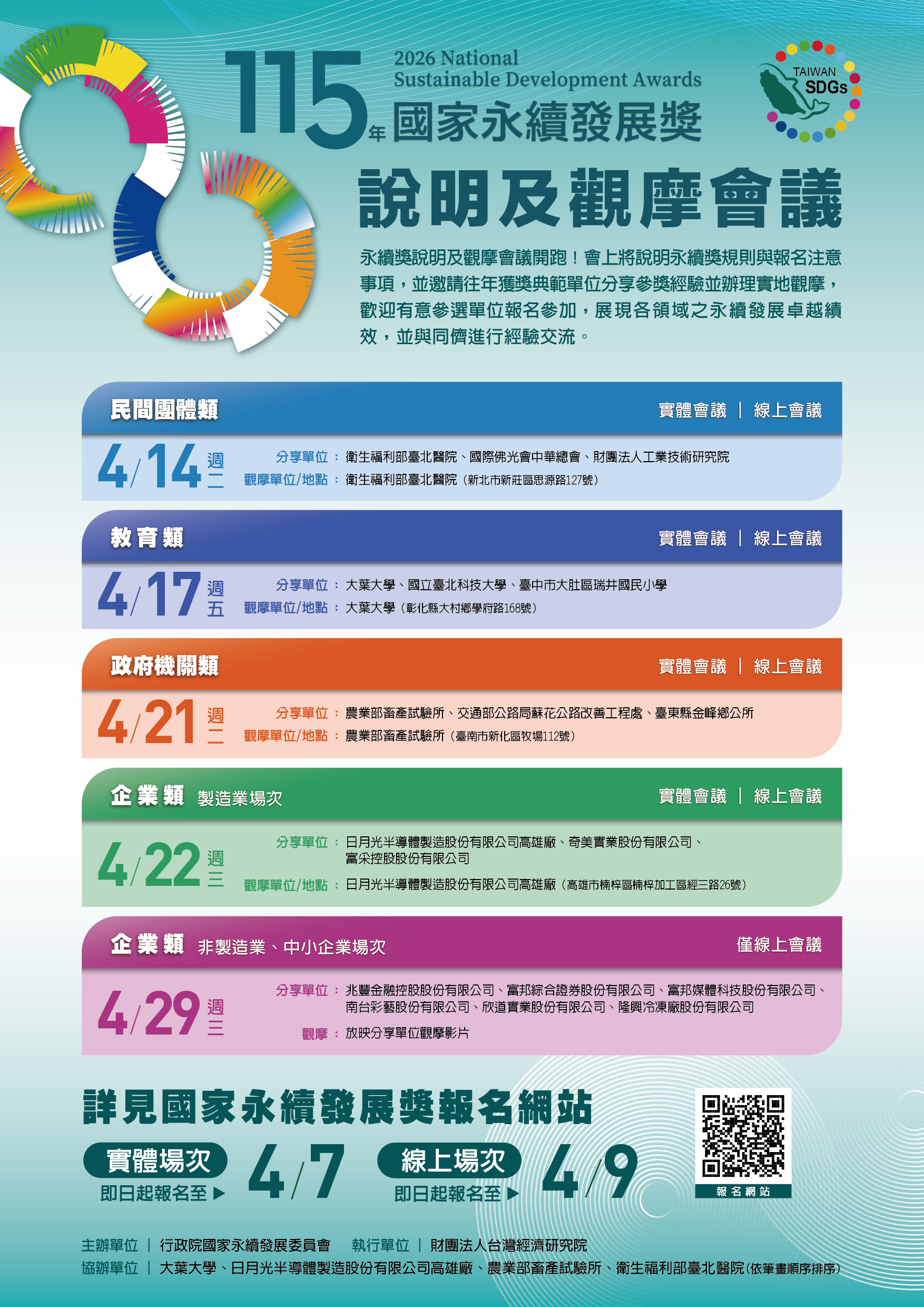 二、為增進各界對於國家永續發展獎之瞭解,並促進永續發展相關經驗互相交流與分享,另舉辦「115年國家永續發展獎 說明及觀摩會議」共計5場次,均可免費線上報名,歡迎有意參加本年度國家永續發展獎選拔者踴躍參加,活動資訊請參考附件。活動資訊網址:https://gov.tw /XST。