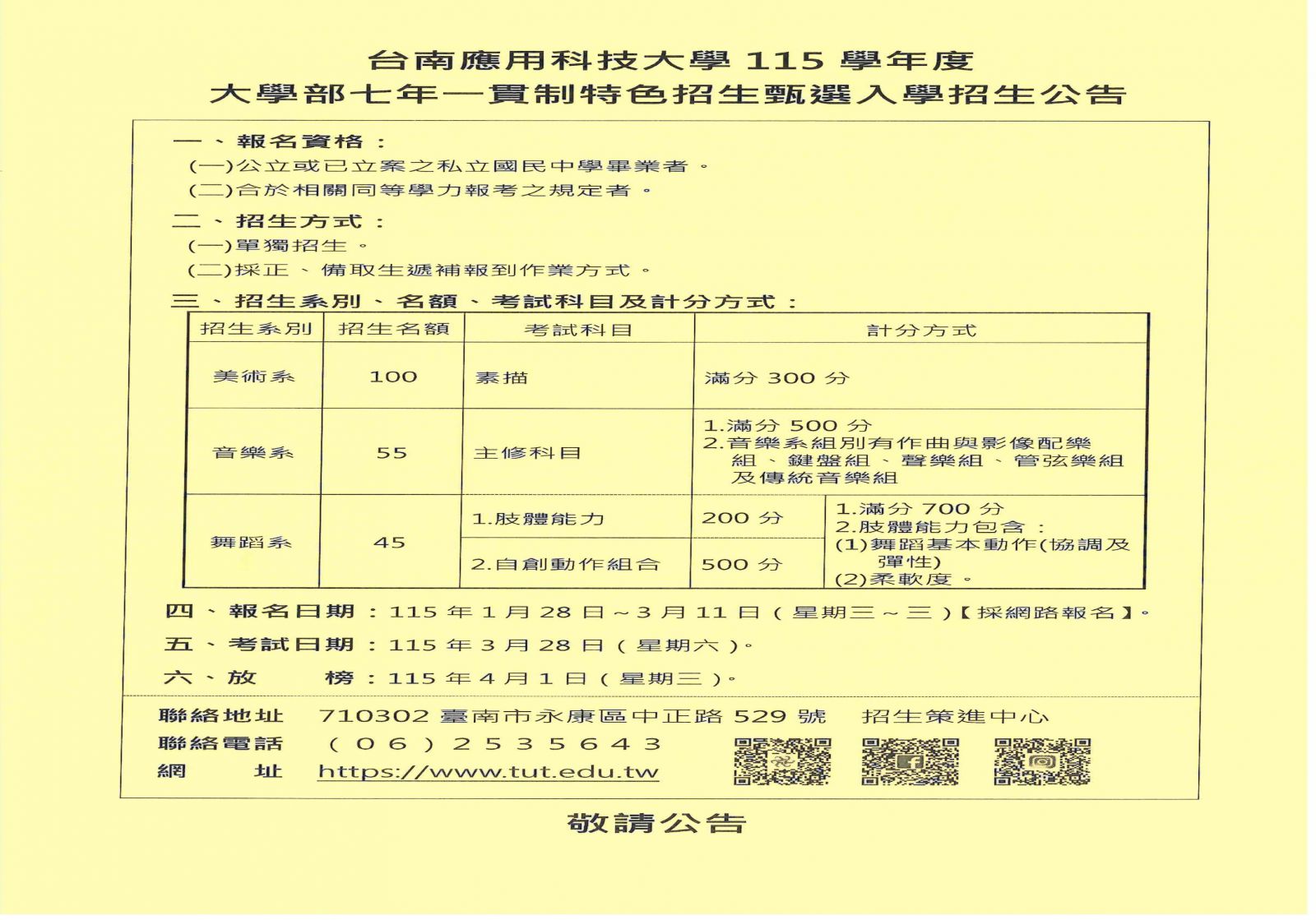台南應用科技大學115學年度大學部七年一貫制特色招生甄選入學招生公告