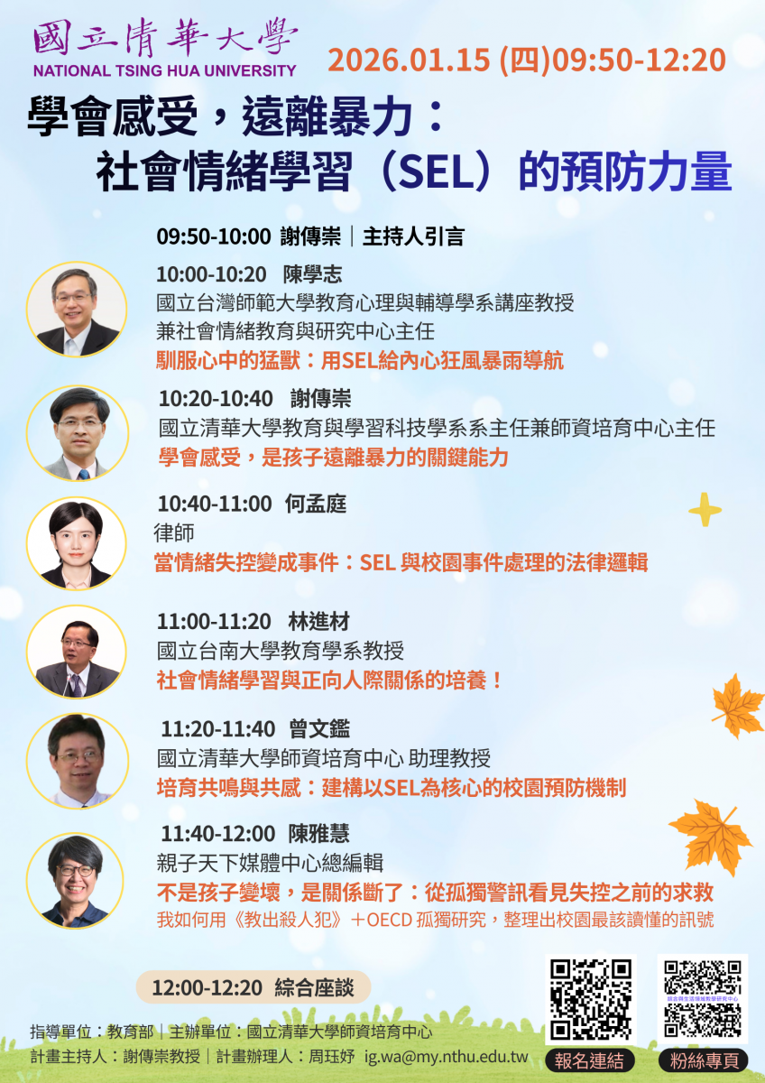 轉知國立清華大學師資培育中心辦理「學會感受,遠離暴力:社會情緒學習(SEL)的預防力量」
